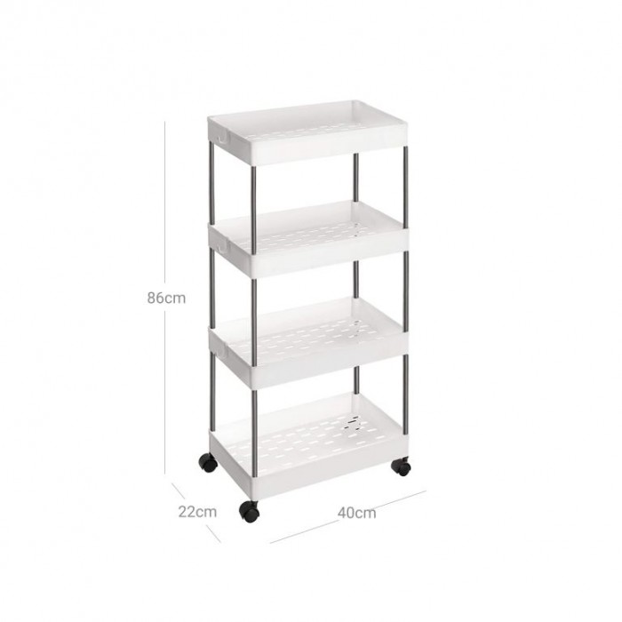 Stabilní konstrukce z kovových trubek a kvalitního PP plastu zaručuje dlouhou životnost. Každá police unese až 5 kg, celkem tedy až 20 kg. Díky čtyřem kolečkům s kovovými osami je přesun regálu snadný a plynulý. Montáž zvládnete během chvilky bez složitého nářadí.