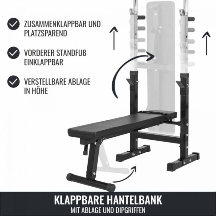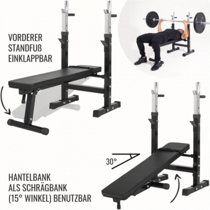 Posilovací set je vhodný pro začátečníky i pokročilé uživatele. Pětipolohový stojan lze snadno nastavit na správnou velikost pro vyváženou zátěž bez přetěžování kloubů a vazů. Popruh na nohy pomáhá posilovat břišní svaly a integrované rukojeti pomáhají posilovat svaly prsní a tricepsy. Čtyři činkové tyče se zátěžovými deskami různých váhových kategorií nabízejí vhodné příslušenství pro efektivní trénink jednotlivých svalových skupin. Díky sklopným nohám lze posilovací lavici používat také jako šikmou lavici.