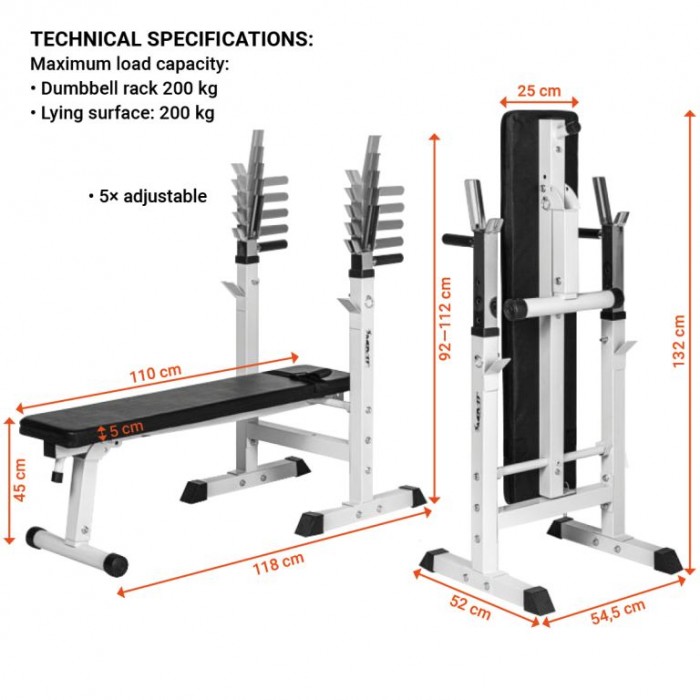 - max. nosnost stojanu a lavice na činky: 200 kg (vč. tělesné hmotnosti)