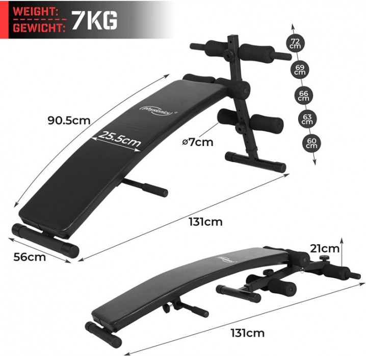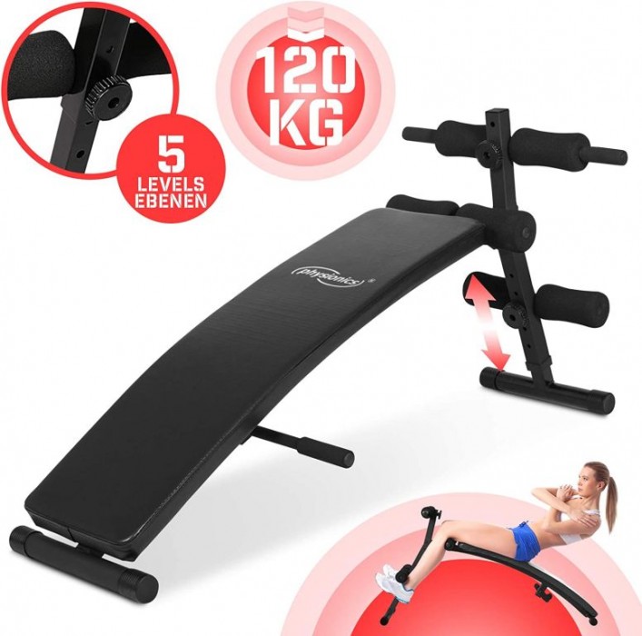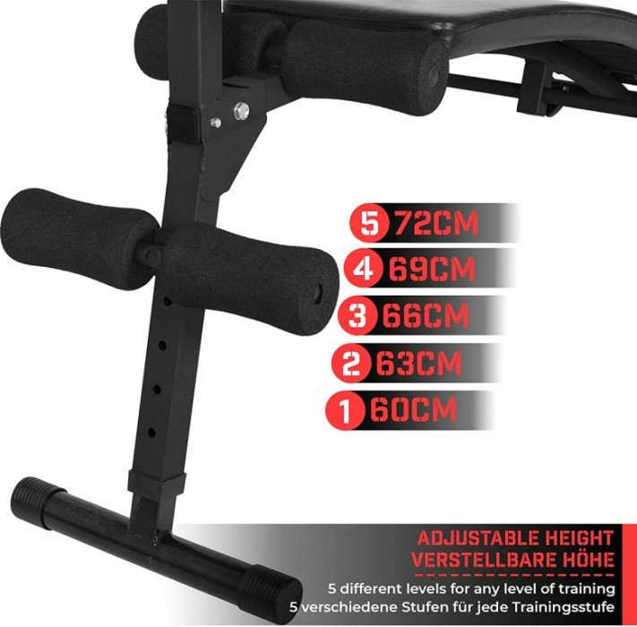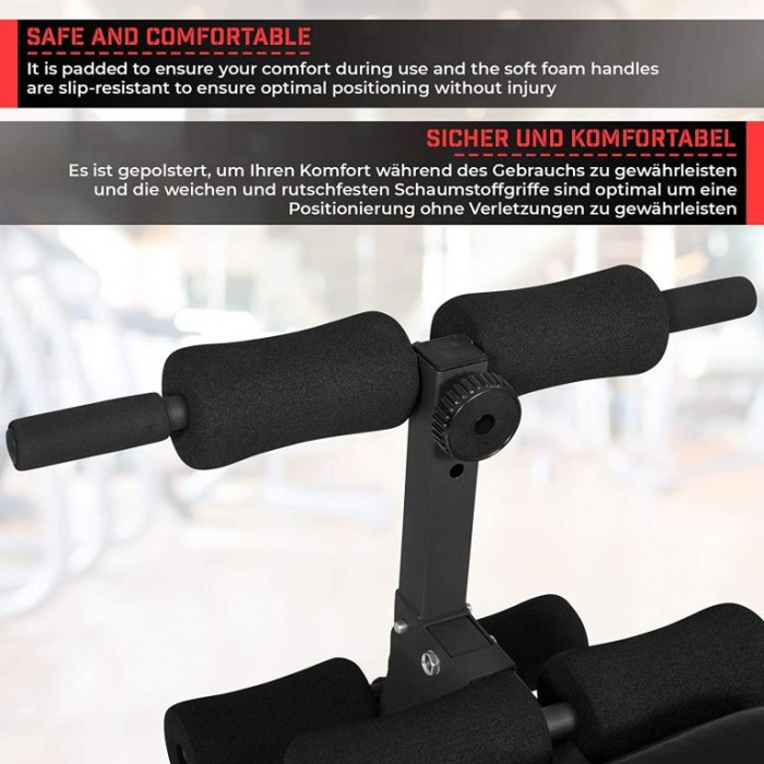 Chcete-li zvýšit účinnost cvičení, upravte sklon lavičky Sit Up. Pokud trenažér na cvičení břišních svalů jednou nepotřebujete, složte ho a uložte, abyste ušetřili místo. Tuto moderní tréninkovou lavici vyrobenou z oceli lze zatížit až přibližně 120 kilogramy. Velká lehací plocha byla potažena imitací kůže a je měkce polstrovaná. K fixaci nohou jsou připojeny čtyři protiskluzové pěnové válečky, které poskytují optimální oporu pro vaše nohy.