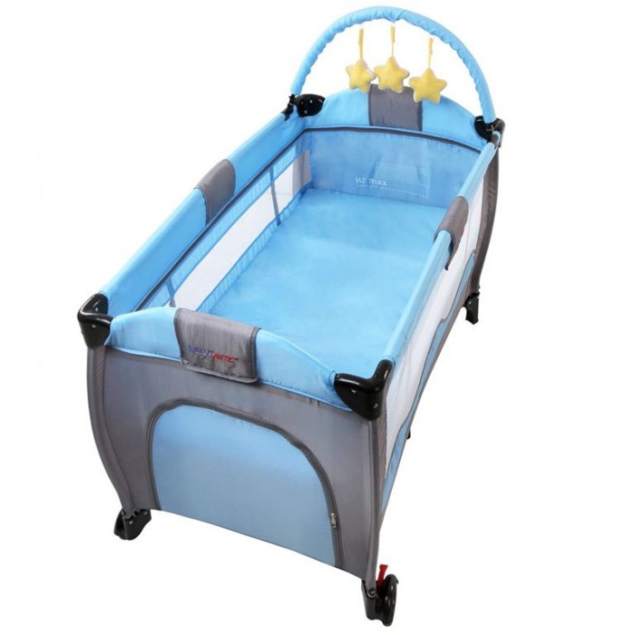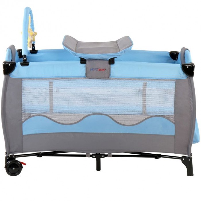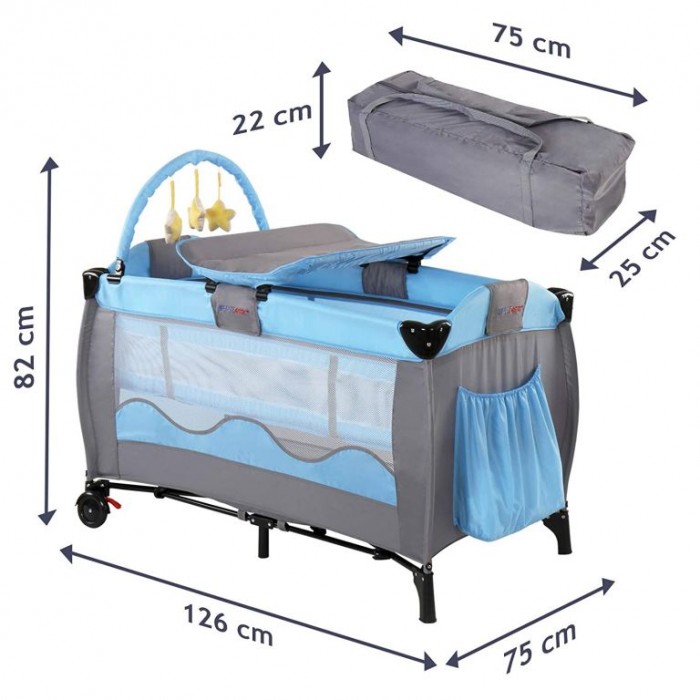 Popis: Cestovní dětská postýlka s přebalovacím pultem, modro / šedá