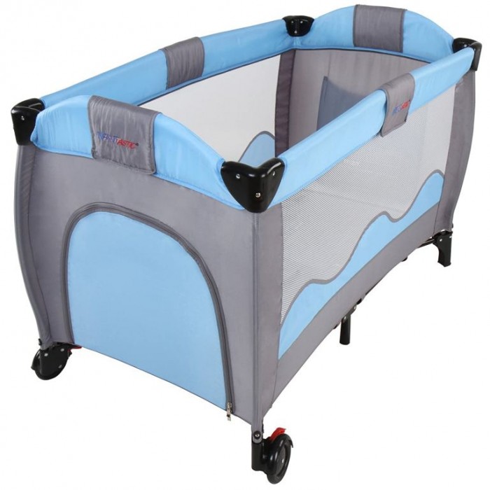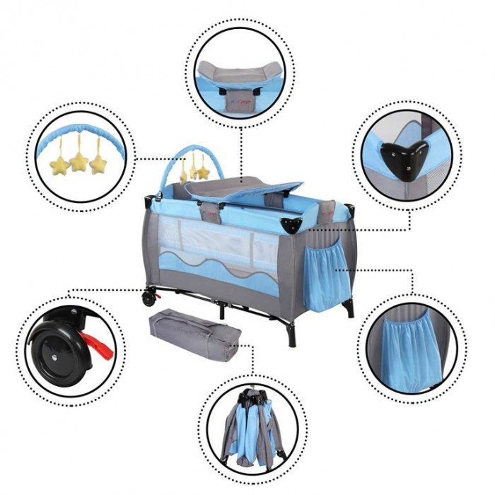 Cestovní dětská postýlka s přebalovacím pultem, modro / šedá
