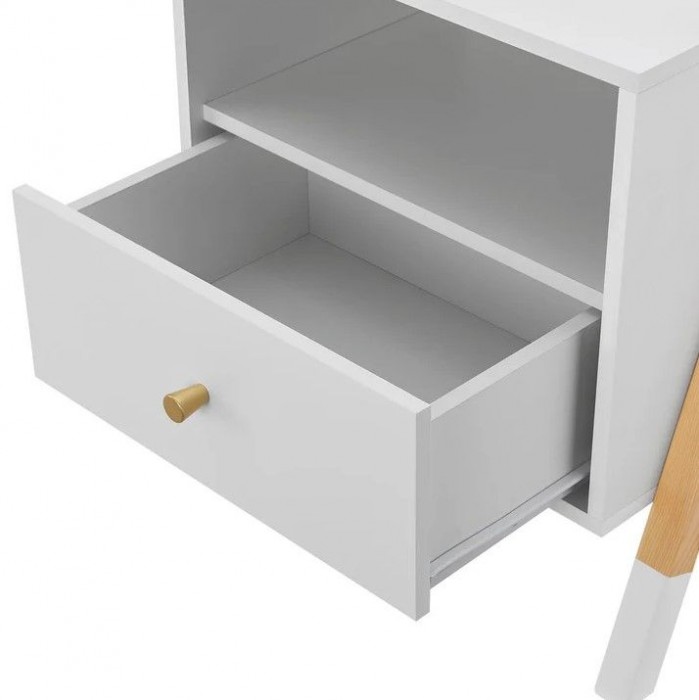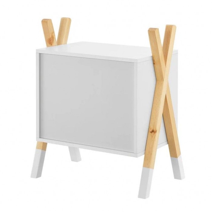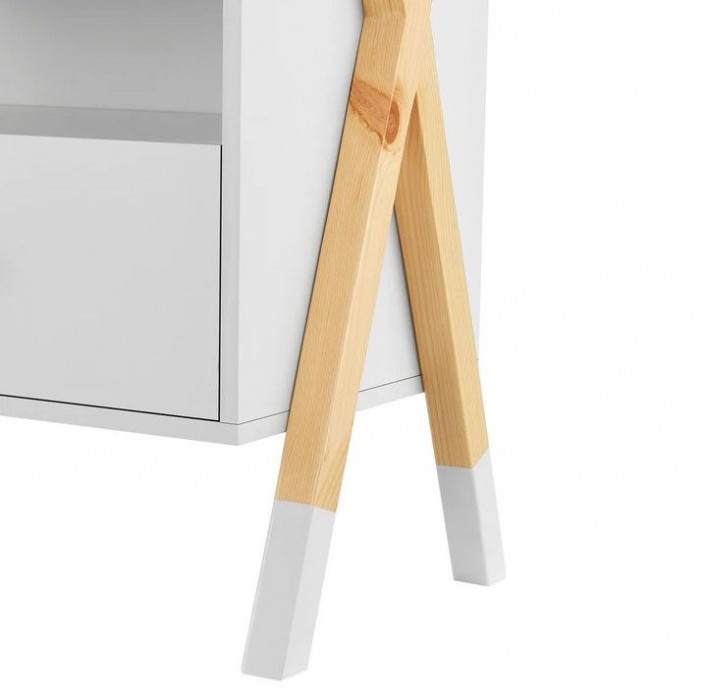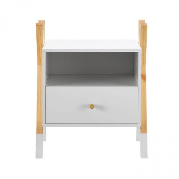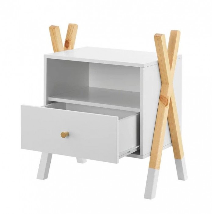 Stolek je vyroben z MDF a borovicového dřeva, což zajišťuje stabilitu a dlouhou životnost. Snadná údržba – povrch stačí otřít vlhkým hadříkem. Šuplík, otevřená police i horní plocha nabízí dostatek místa na lampičku, knížky či budík.