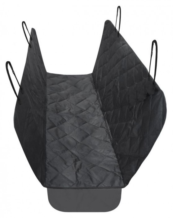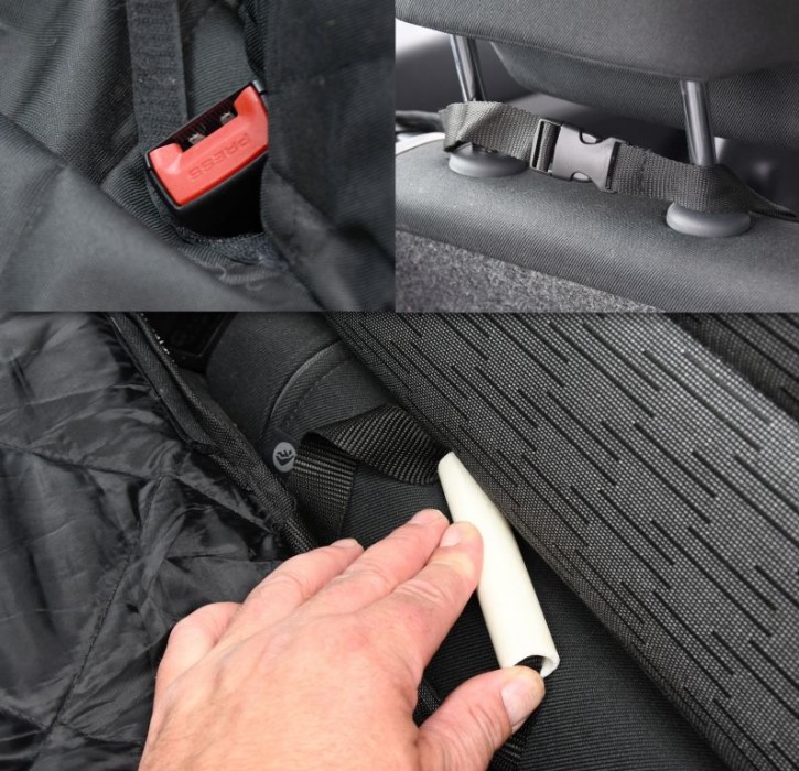 Prošívaný, vícevrstvý materiál zajišťuje pohodlné cestování psa. Deka ochrání i zadní stranu předních sedadel, a navíc i boční strany sedadel, díky uším na bocích. Deka je opatřena otvory pro bezpečnostní pásy, uzavíratelné na suchý zip. Upevnění je řešeno za opěrky hlavy s fixací mezi sedadly.