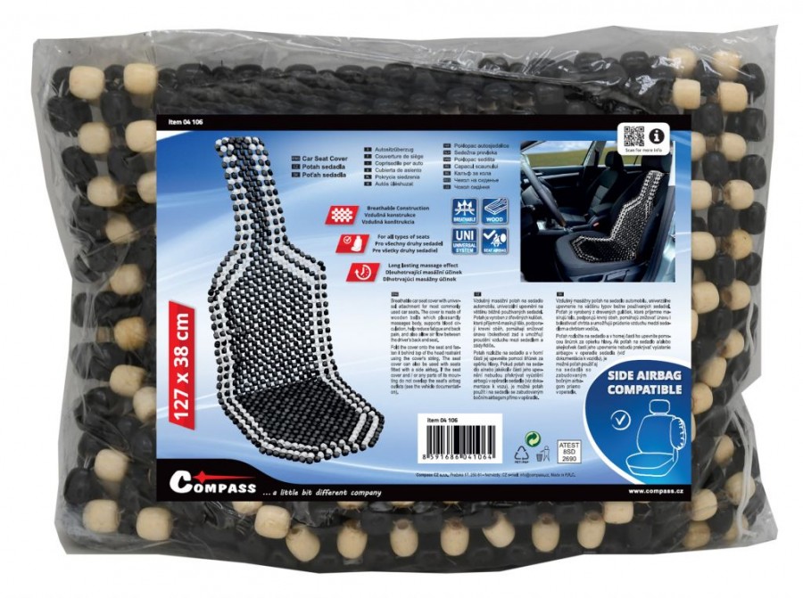 Potah je vyroben z dřevěných kuliček, které příjemně masírují tělo, podporují krevní oběh, pomáhají snižovat únavu i bolestivost zad a umožňují proudění vzduchu mezi sedadlem a zády řidiče. Potah rozložte na sedadlo a v horní části jej upevněte pomocí šňůrek za opěrku hlavy. Pokud potah na sedadlo a/nebo jakákoliv část jeho upevnění nebudou překrývat vyústění airbagů v opěradle sedadla, je možné potah použít i na sedadla se zabudovaným bočním airbagem přímo v opěradle.