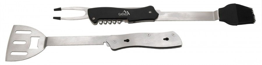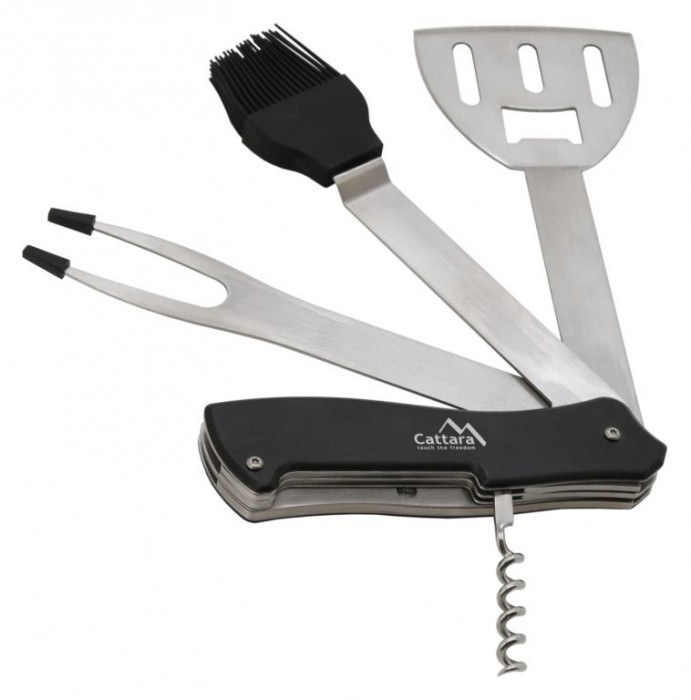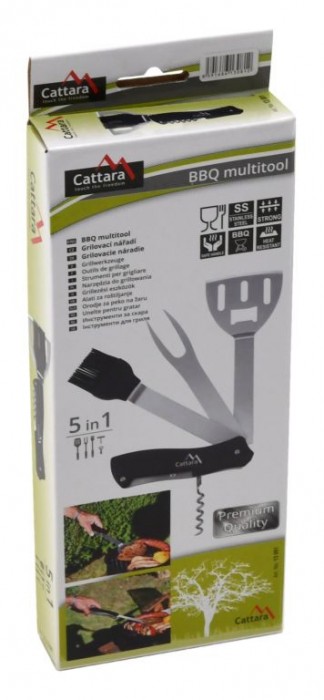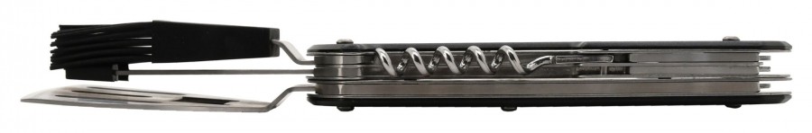 Grilovací nářadí 5in1 je praktický pomocník pro grilování. Rukojeť je v úchopové části opatřena černým obložením pro pohodlnější úchop. Rukojeť lze jednoduše rozdělit na dva nátroje. Nástroj je opatřen obracečkou, otvírákem na korkové špunty, otvírákem na zátky lahví, vidlicí a mašlovačkou. Uplatnění tak najde v tábořišti, v kempu, jinde v přírodě, ale i doma při grilování.
