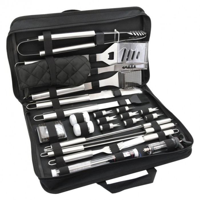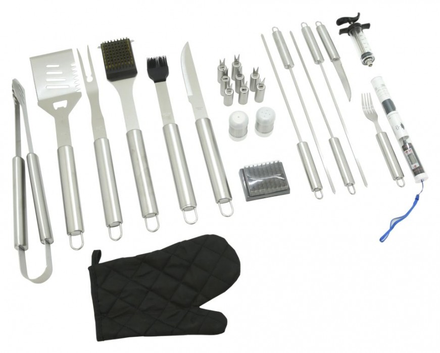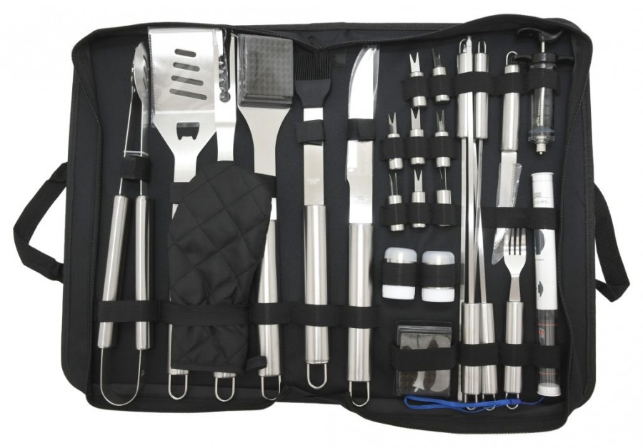 Sada obsahuje veškeré nástroje pro přípravu a konzumaci nejrůznějších pokrmů, ale i následnou údržbu grilu. Veškeré nástroje jsou navíc kvalitně zpracovány z nerezové oceli. Mimojiné je součástí sady i injekce pro aplikaci marinády do masa a praktický teploměr s nerezovou sondou pro ověření provedení masa s rozsahem měření -50 - 300°C. O napájení teploměru se stará 1x baterie LR44 (1,5V). Sada je úhledně umístěna v textilní brašně a hodí se pro ty nejnáročnější vyznavače dobrého jídla. Výčet jednotlivých nástrojů ocení kdokoliv. Sada je primárně určena k využití doma na zahradě, ovšem užitečná je i na cestách.