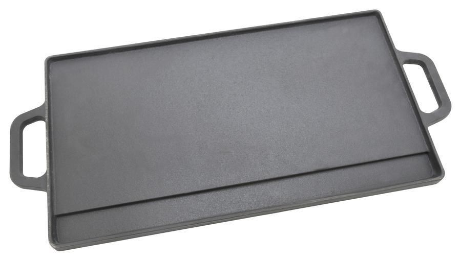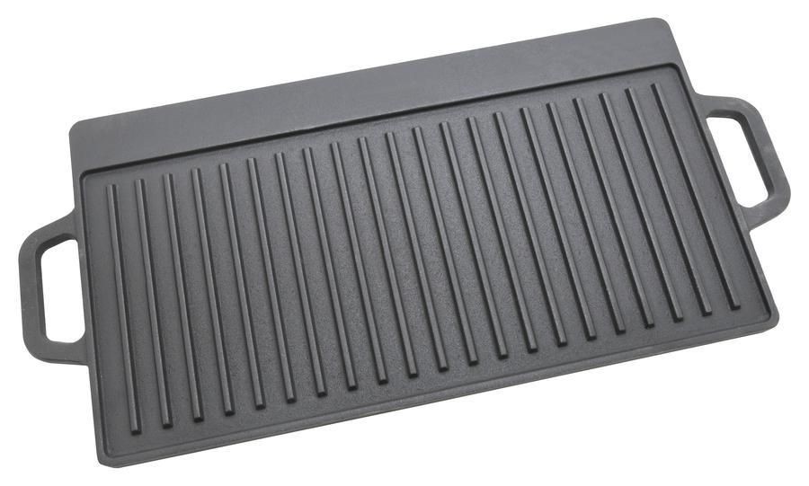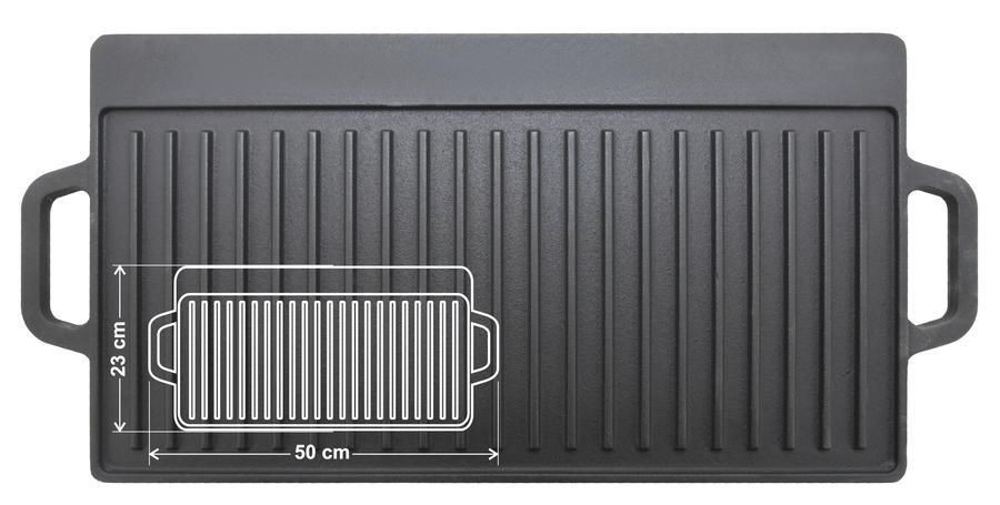 Oboustranný grilovací plát pro grilování masitých, ale i ostatních pokrmů je vyroben z litiny s rozměry 50 x 23 cm a šířkou 1,4 cm. Je oboustranný a nabízí prostor pro tepelnou úpravu masitých pokrmů s typickou drážkovanou strukturou. Druhá strana plátu má hladký povrch, který zabezpečí grilování např. zeleniny, směsí a ostatních pokrmů. Plát lze použít na jakýkoliv gril patřičných rozměrů.
