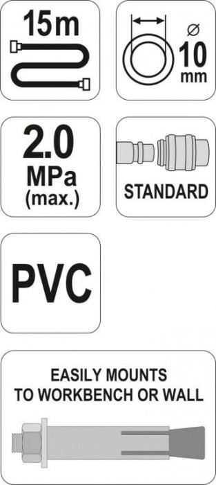 Hadice je zhotovená z PVC odolného vůči nízkým i vysokým teplotám, může tak být použita i mimo dílnu. Rychloupínací spojka 1/4" vhodná pro běžné využití v dílně nebo výrobním závodě.