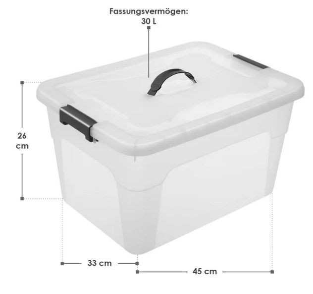 Popis: Sada 4 úložných boxů s víkem 30 l, plastové, průsvitné