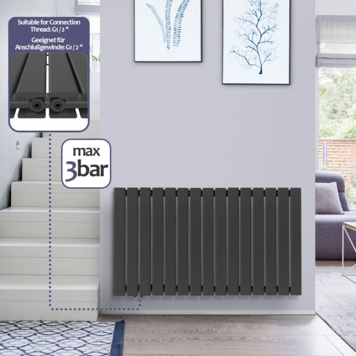 Tento moderní radiátor nabízí kromě plochého vzhledu i působivý výkon. S tepelným výkonem 1365 wattů, antracitovou ocelovou konstrukcí a moderním designem zahřeje nejen váš domov, ale i váš interiér. Upozornění: Ventily radiátorů nejsou součástí balení.