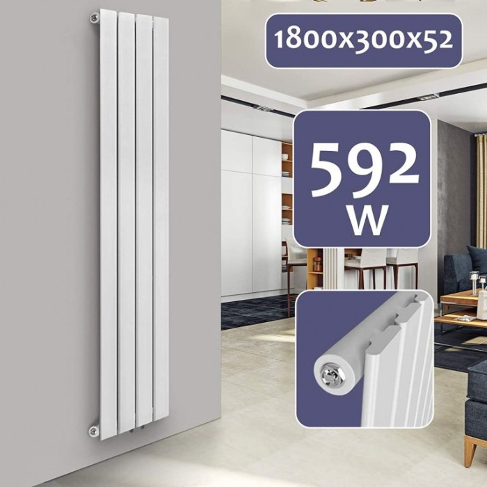 Popis: Vertikální radiátor, středové připojení, 1800 x 300 x 52 mm