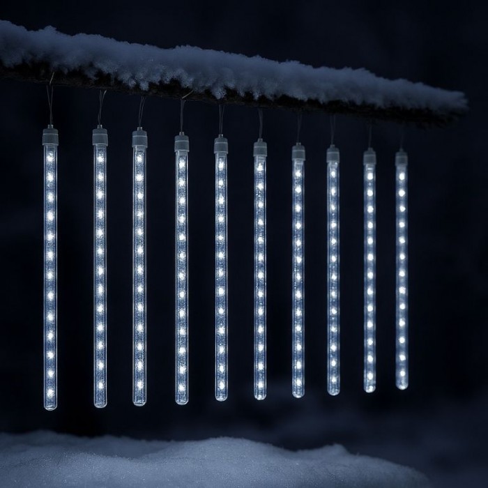 Dopřejte si překrásné vánoční osvětlení ve tvaru rampouchů s efektem meteorů nebo vodopádu. Je určeno pro použití ve vnitřních i vnějších prostorách. Osvětlení je vhodné nejen na Vánoce, ale pro jakoukoli příležitost především během chladnějšího období roku. Přívodní vedení od transformátoru k první tyči je dlouhé přibližně 5 metrů, takže máte dostatek prostoru pro umístění světelných tyčí.