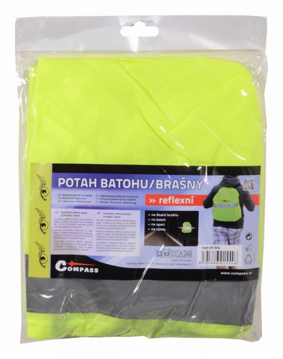 Univerzální upevnění pomocí všité gumy a gumových popruhů. Zejména za snížené viditelnosti či v šeru potah na batoh několikanásobně prodlužuje vzdálenost, na kterou řidič zpozoruje chodce. Ideální na túry či na cyklistické výlety.