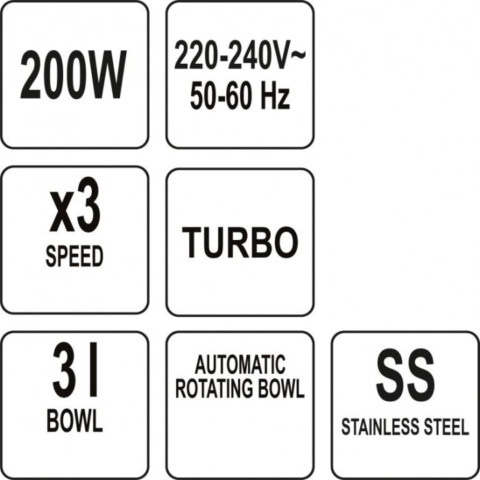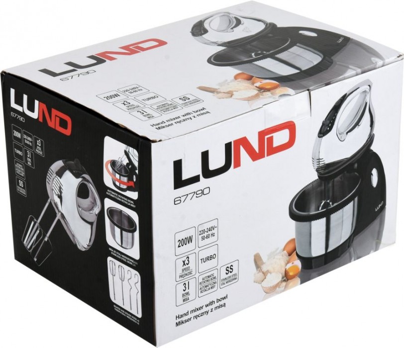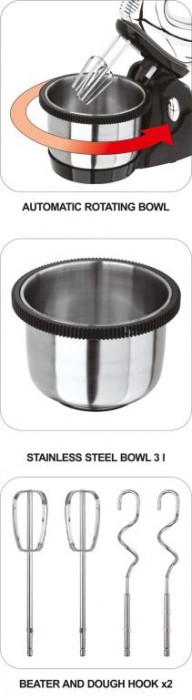 Nastavit lze 3 úrovně výkonu podle Vašich požadavků, včetně možnosti dočasně zvýšit výkon stiskem tlačítka TURBO. Balení obsahuje kromě mixéru, nerezovou mísu, pár metel a pár hnětacích nástavců.