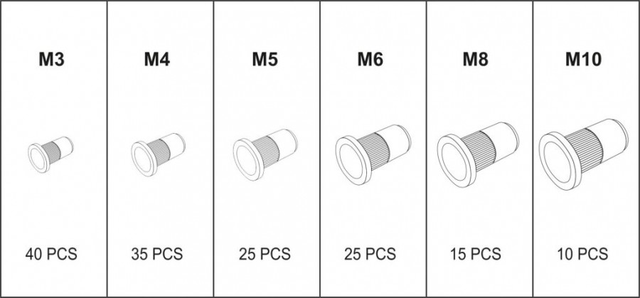 Popis: Sada ocelových nýtovacích matic M3-M10 150 ks