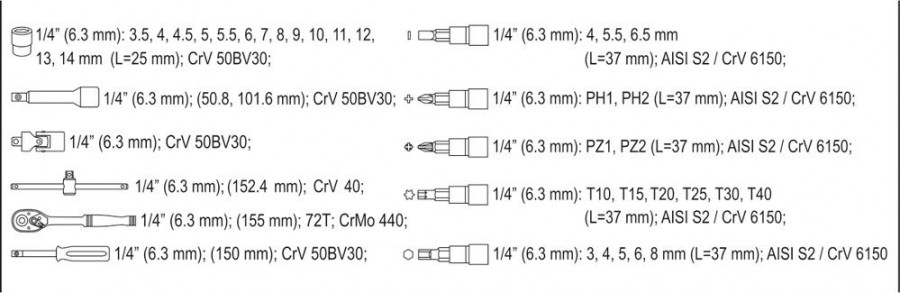 Nástrčné klíče: 3,5-4-4,5-5-5,5-6-7-8-9-10-11-12-13-14mm, délka 25mm