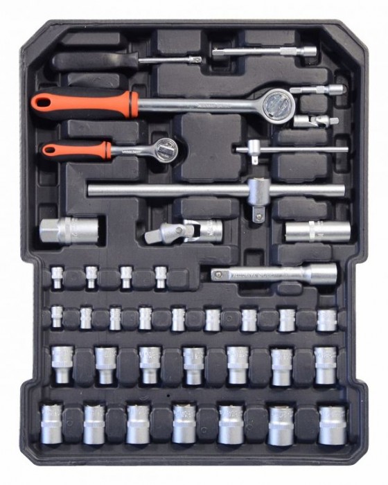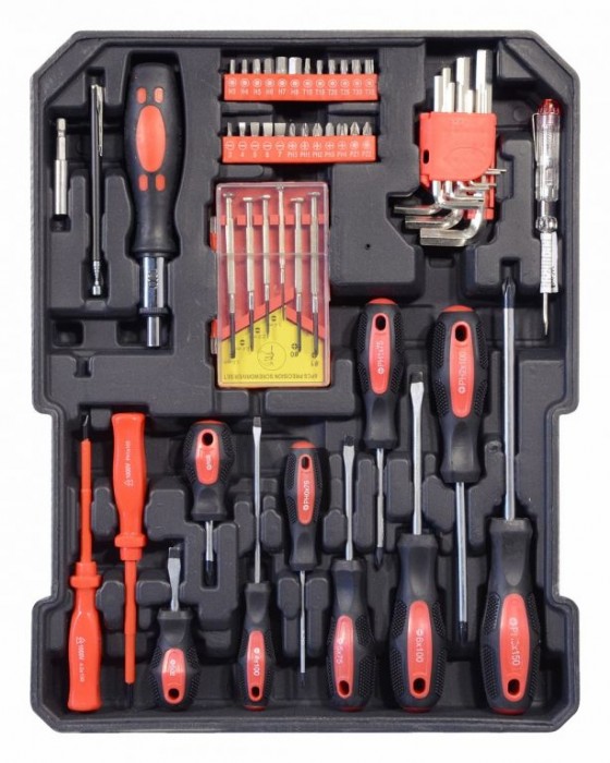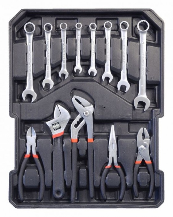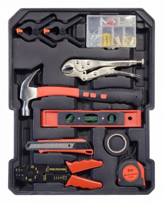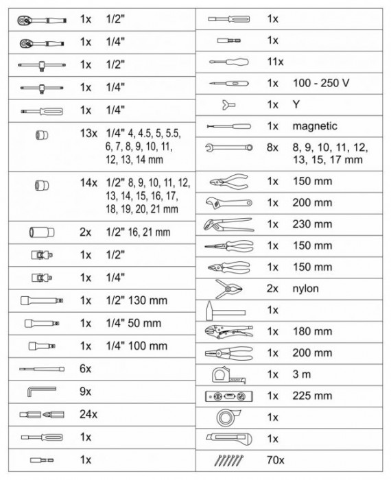 Sada obsahuje celou řadu kleští, šroubováků, gola klíčů, kladivo, vodováhu, stranové i imbus klíče, bity, základní spojovací materiál a celou řadu dalšího nářadí, které je vhodné pro použití jak doma, v garáži, tak i na cestách.