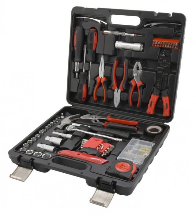 Praktický přenosný kufřík s kvalitním nářadím a základním spojovacím materiálem. Sada obsahuje ergonomické šroubováky, imbusové klíče, žiletkový nůž, nejběžnější typy kleští včetně elektrikářských, kladivo, 3/8" ráčnu s nástavci, LED svítilnu, šroubovák na bity včetně 20ks bitů, svinovací metr (5 m), izolační pásku a další. Mimojiné je sada opatřena pouzdrem s 92 ks spojovacího materiálu. Je obzvláště vhodný pro domácí použití, ale uplatnění najde i v garážích a na cestách.