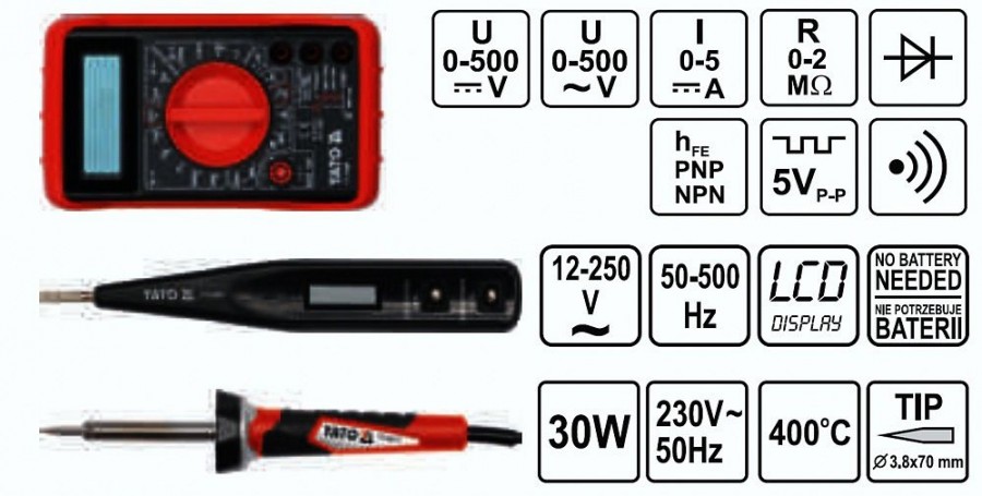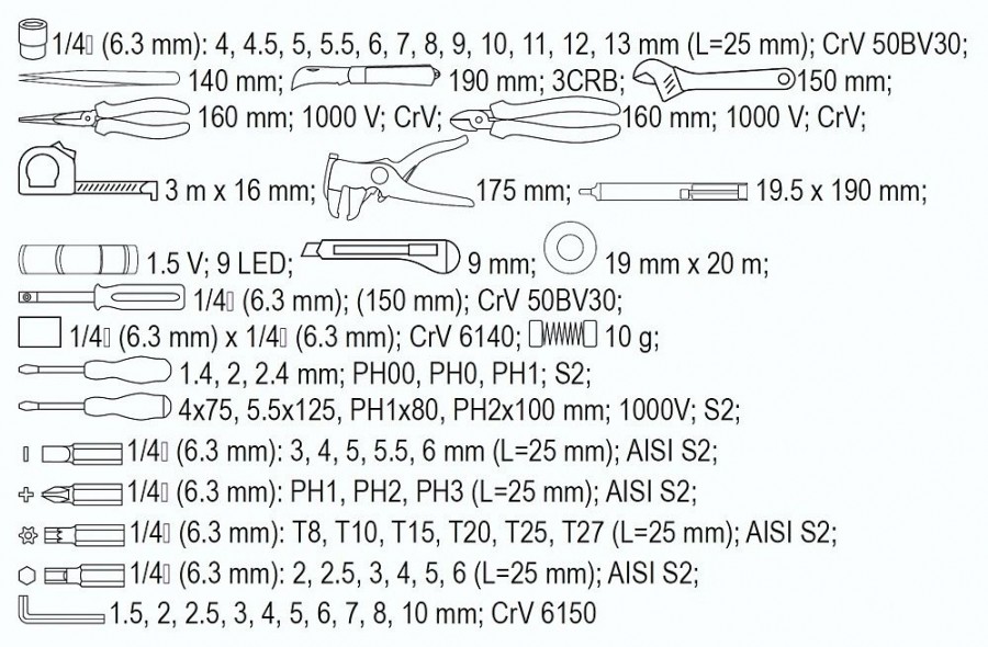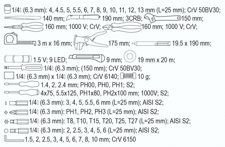 Profesionální sada nářadí YATO pro elektrikáře. Obsahuje 68 speciálně vybraných nástrojů. Kleště a šroubováky v sadě jsou izolovány až do 1000 V.