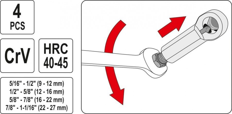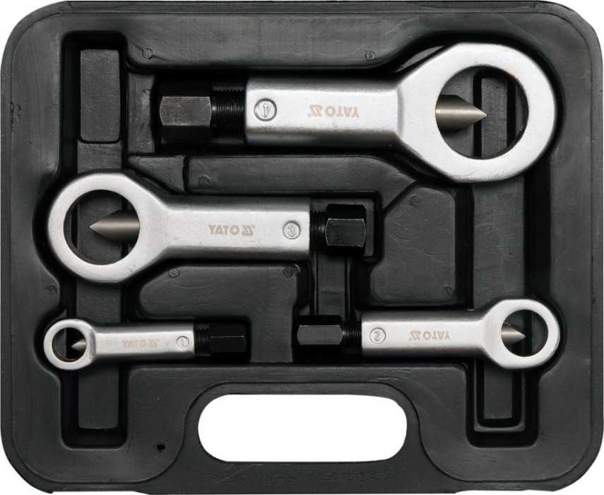 V soupravě jsou 4 odstupňované hlavice pro demontáž matic od 9 - 27 mm. Přípravky jsou zhotoveny z chrom-vanadiové, zápustkově kované, kalené a temperované oceli. Souprava pracuje na principu rozštípnutí matice šroubováním. Zakončení jednotlivých přípravků odpovídají klíčům a nástavcům 12; 14; 19; 21 mm.