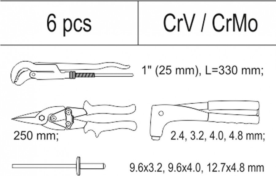 Popis: Vložka do zásuvky - kleště nýtovací, 3x sada nýtů, nůžky na plech, hasák 330mm