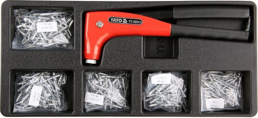 Sada 6 kusů nýtovacích kleští a nýtů. Sada je přehledně srovnána ve vložce do zásuvky z PVC.