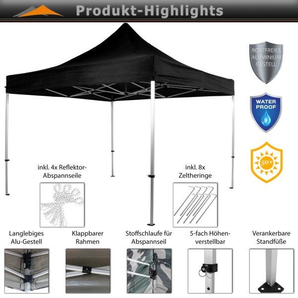 Skládací stan je vysoce kvalitně zpracován. Stan je 100 % funkční. Je totiž vodotěsný a díky speciálně impregnované střešní krytině blokuje až 98 % UV slunečního záření. Nerezový rám poskytuje ochranu vůči poškrábání a korozi. Pro další stabilitu a podporu slouží zvětšené nohy konstrukce, extrastabilní spojovací materiál a vysoce kvalitní klikací systém se zajištěním vnějším šroubem s tažným kroužkem. Pro podporu střechy je intergrovaný středový napínací sloupek.