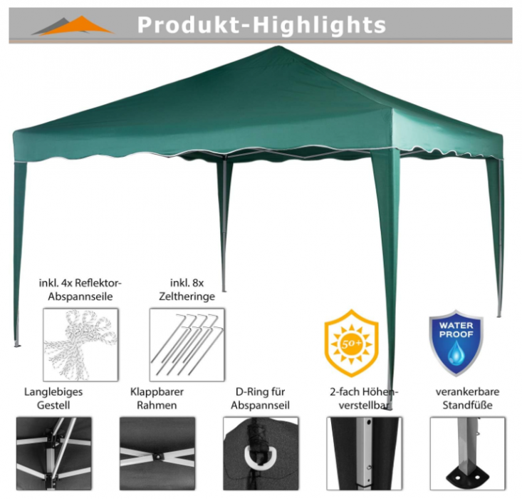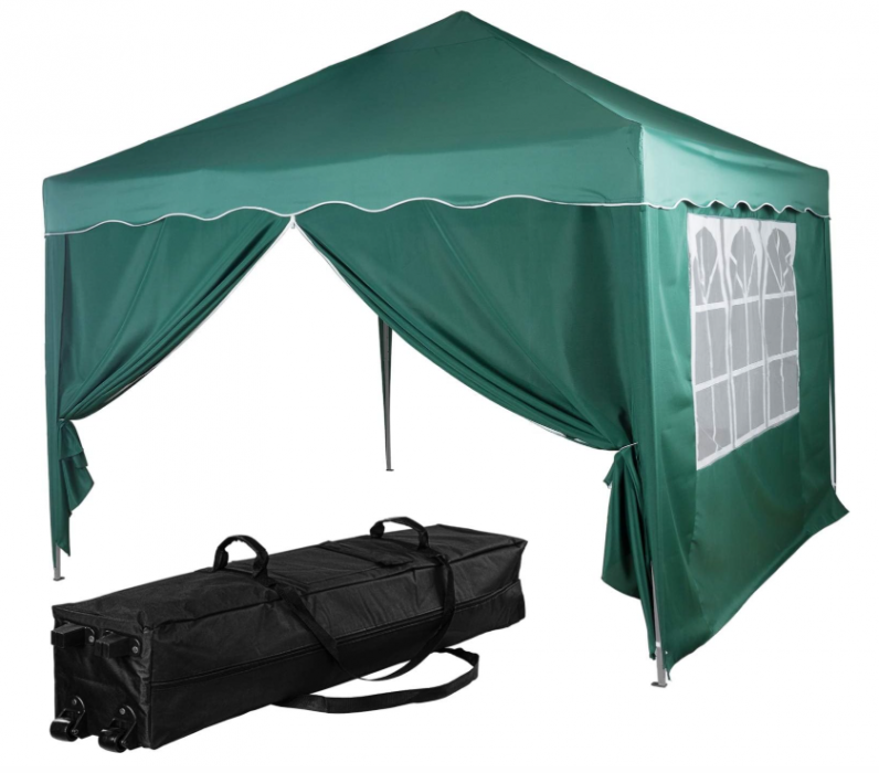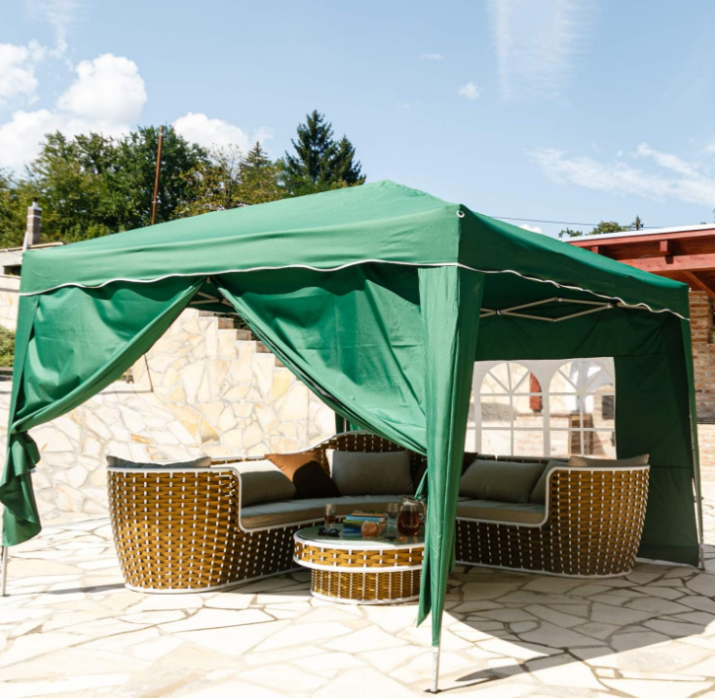 Vytvořte si dokonalé místo pro letní pohodu – tento skládací stan ochrání před deštěm i ostrým sluncem. Elegantní tmavě zelený design se hodí na každou zahradu a poskytne příjemný stín i soukromí při každé příležitosti.