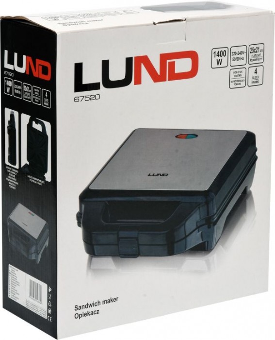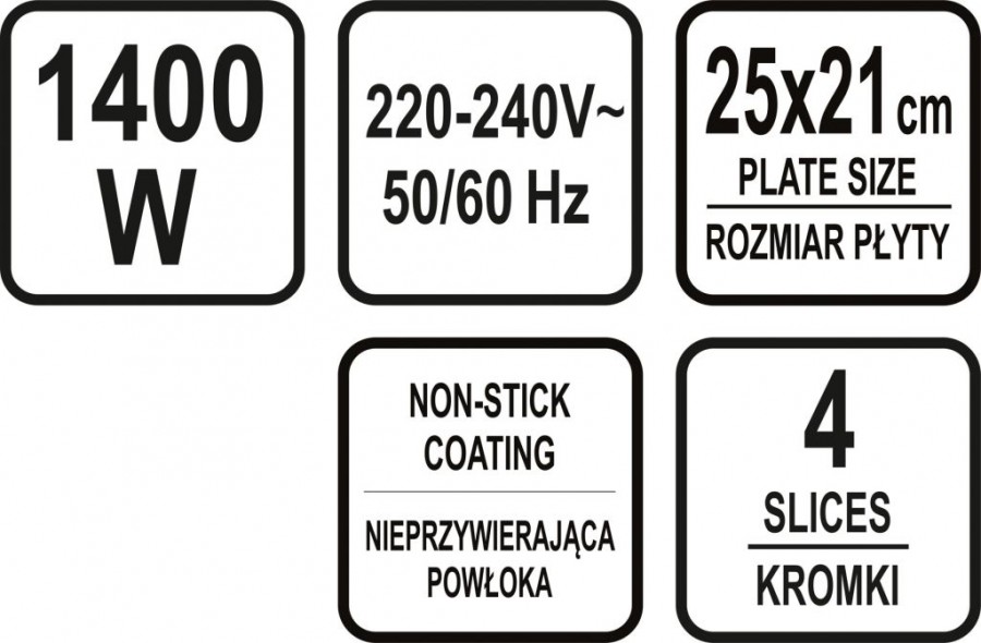 Toustovač pro opečení 4 toustů. Zařízení je opatřeno nepřilnavým povrchem ulehčujícím čištění a zároveň zajišťuje rovnoměrné opečení. Napájení pomocí 230V zajistí 0,7 m dlouhý kabel.