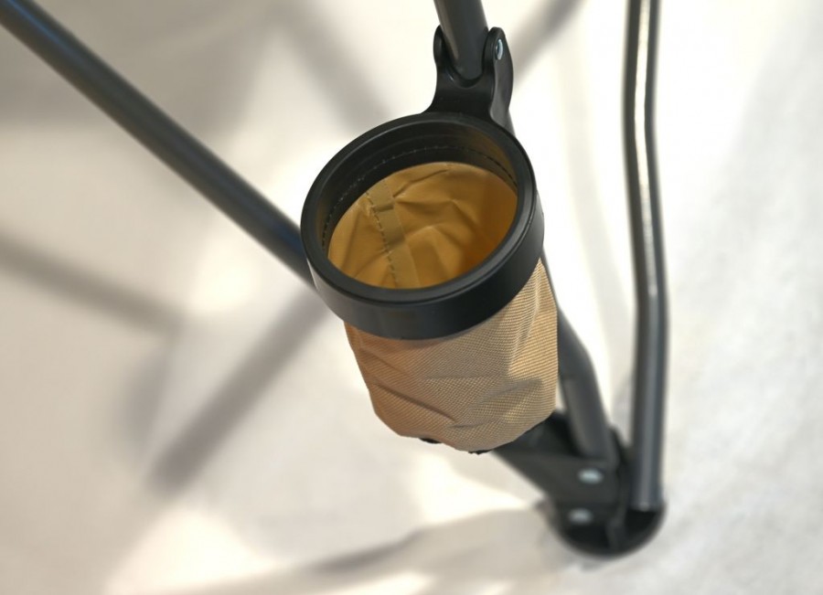 Pravý bok židle je doplněn o držák nápoje se sítěným dnem. Zádová část křesla je navíc opatřena bederní opěrkou, kterou lze nastavit pomocí popruhů na bocích.
