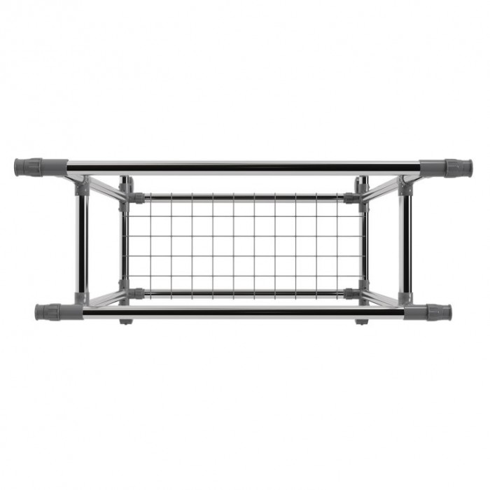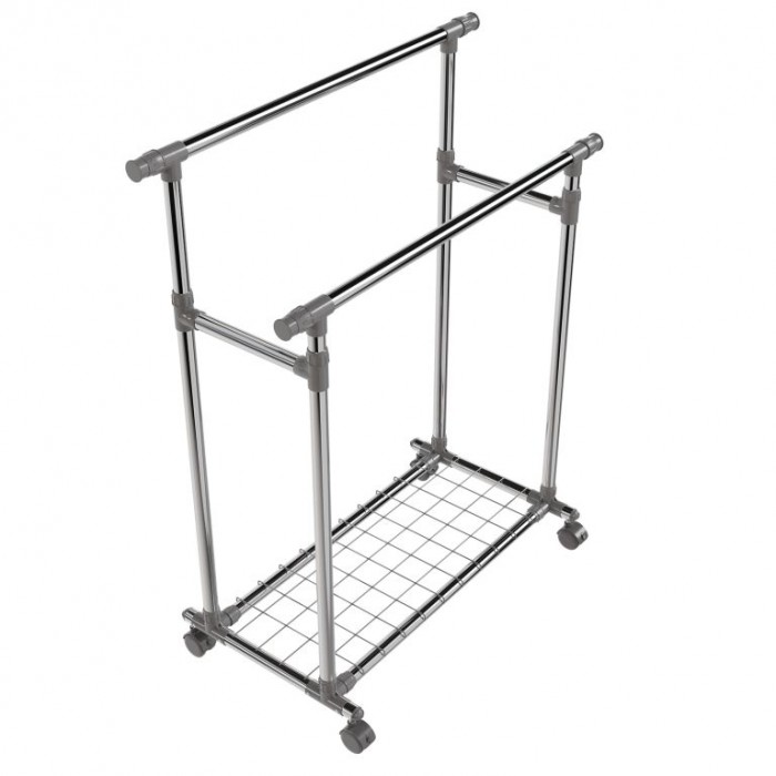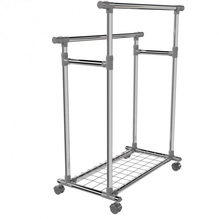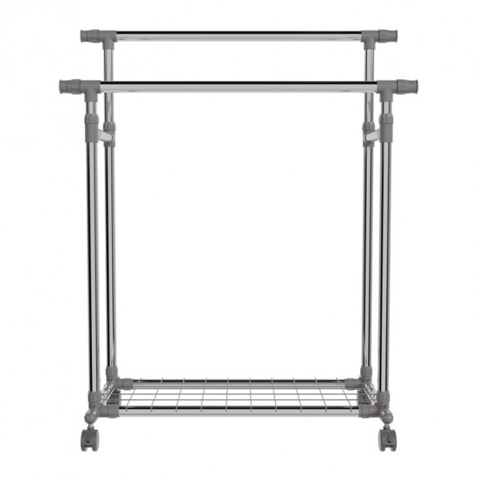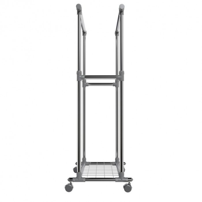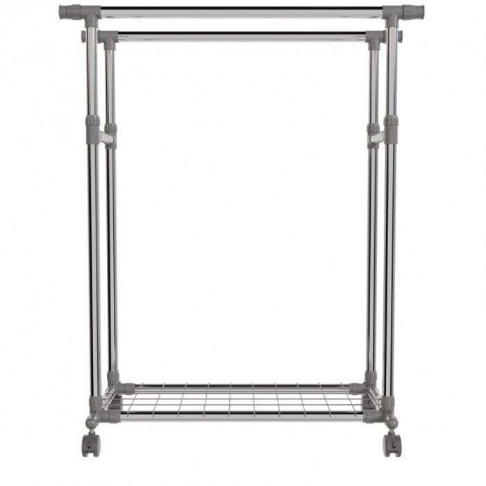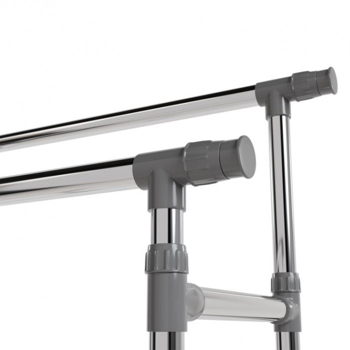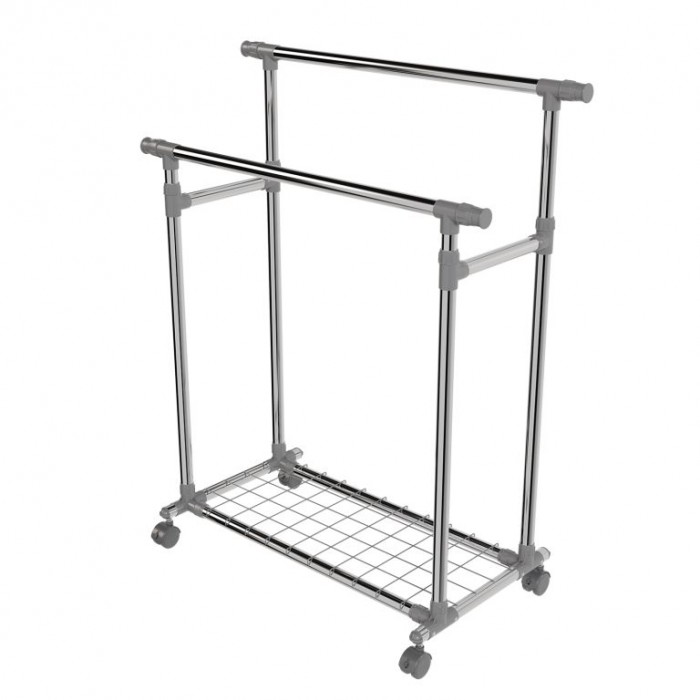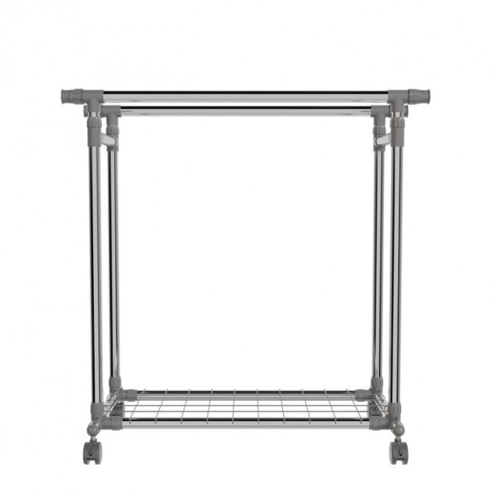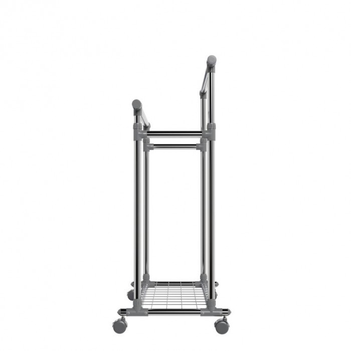 Stojan je vyroben z nerezových trubek, které zajišťují stabilitu a dlouhou životnost. Obě tyče jsou výškově nastavitelné a po stranách výsuvné, čímž nabídnou více místa. Každá tyč unese až 17 kg, spodní police 3 kg. Čtyři otočná kolečka usnadní manipulaci, přičemž dvě jsou vybavena brzdou pro pevné ukotvení. Díky kompaktní konstrukci se stojan hodí i do menších prostor.