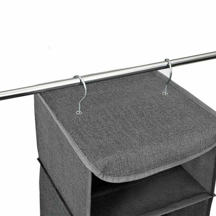 Stabilní konstrukce díky bambusovým výztužím zajišťuje, že se police neprohýbají ani při plném zatížení. Montáž je rychlá – stačí zavěsit na tyč ve skříni. Lehký materiál umožňuje snadné složení a přenášení, ideální i na cesty.