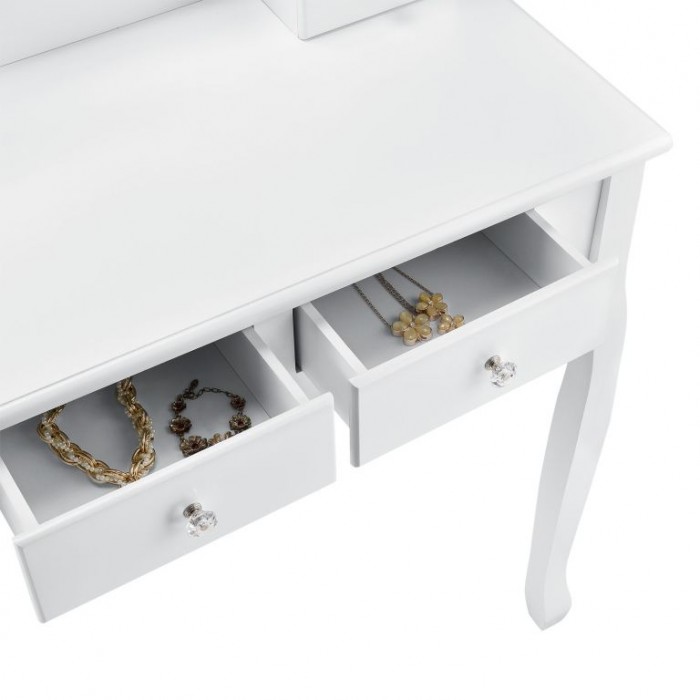 Stolek je vyroben z pevného MDF materiálu s bílým lakem, který chrání povrch před poškrábáním. Čtyři zásuvky umožní přehledné uložení všech kosmetických potřeb. Montáž je snadná a rychlá, údržba nenáročná.
