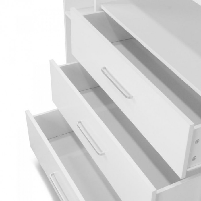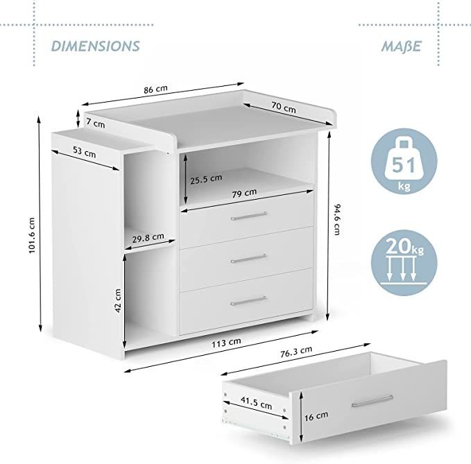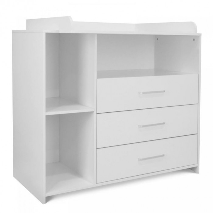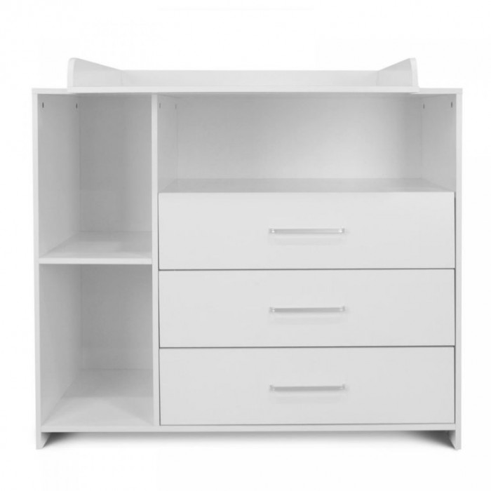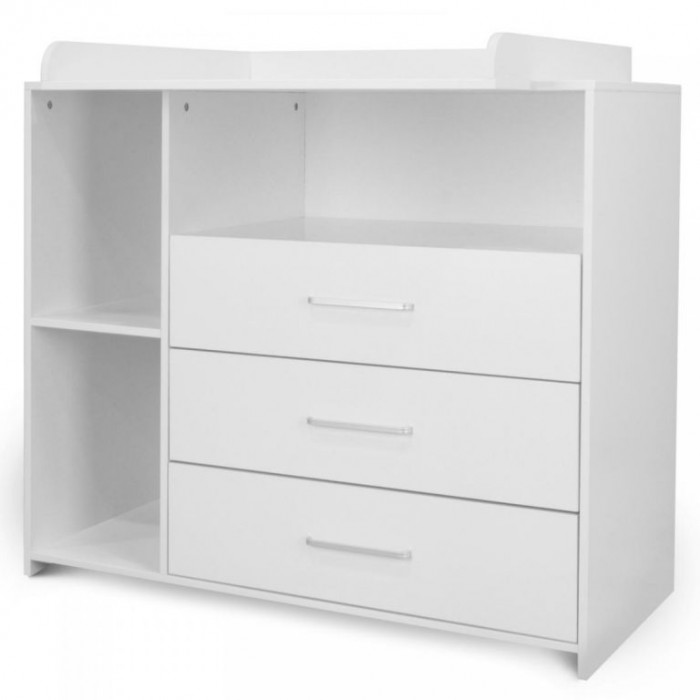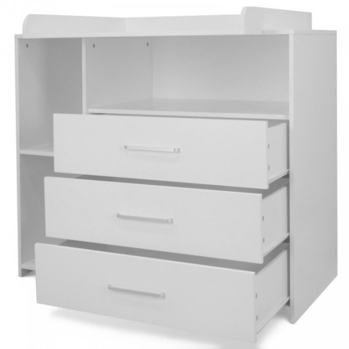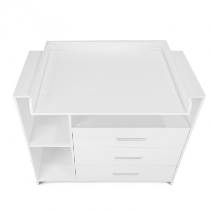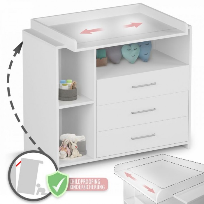 Přebalování na velké přebalovací ploše a pleny, oblečení, výrobky pro péči o dítě a další věci na dosah Vám i Vašemu dítěti zajistí pohodlí. Bílá barva tohoto dětského nábytku se snadno hodí do různých stylů interiérů. Jakmile vaše dítě přebalovacímu věku odroste, můžete přebalovací podložku tohoto multifunkčního kusu nábytku jednoduše trvale odstranit. Komoda tak může být používána i nadále a roste spolu s vývojem vašeho oblíbence.