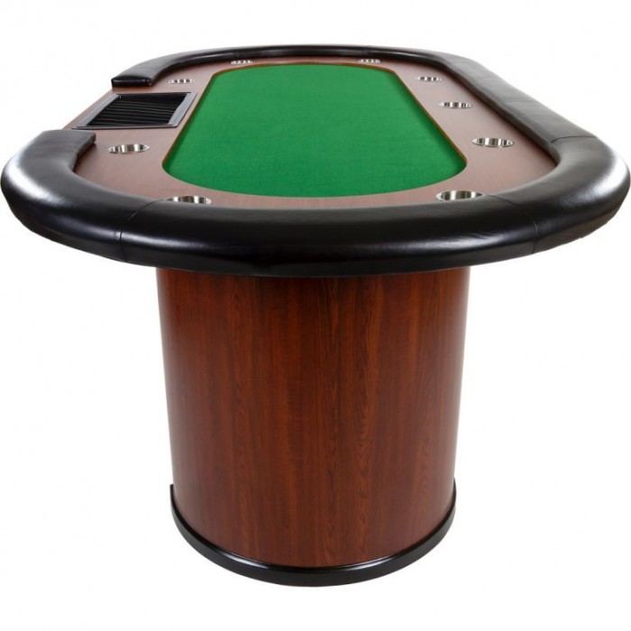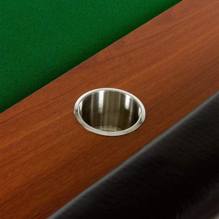 Pokerový stůl "Royal Flush" je kvalitní stůl pro až 9 hráčů a dealera. Ať už Draw Poker Stud nebo populární Texas Hold'em, u tohoto stolu je hraní pokeru zábava. Deska stolu je velmi robustní, z jednoho kusu, o tloušťce 18 mm MDF desky. Půlkruhové masivní nohy z MDF zajišťují optimální stabilitu. Široká polstrovaná opěrka je připevněna k okraji stolu. Kromě toho, deska má více než 9 držáků nápojů z nerezové oceli. Vnitřek stolu je z mahagonového dřeva a nabízí dostatek prostoru pro uložení pokerových žetonů. Dokonalý zážitek z kasina tak může začít během několika minut!