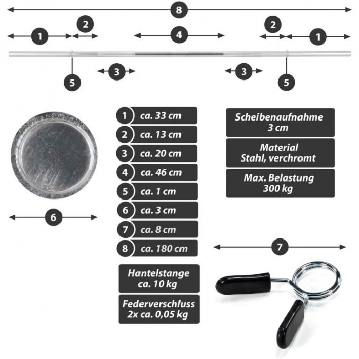 Optimální činka pro použití v posilovně i doma, vhodná pro trénink hrudníku, paží, ramen, krku, posilování, rehabilitační sport, kulturistiku, bench press, mrtvý tah, dřepy, výpady, kliky atd. Deska je upevněna pojistným kroužkem, který zabraňuje sklouznutí závaží během pohybu. Rychlovýměnné pružinové zámky bezpečně fixují závaží na tyči činky a zaručují pohodlnou výměnu závaží. Žebrované rukojeti na tyči umožňují bezpečné uchopení tyče.