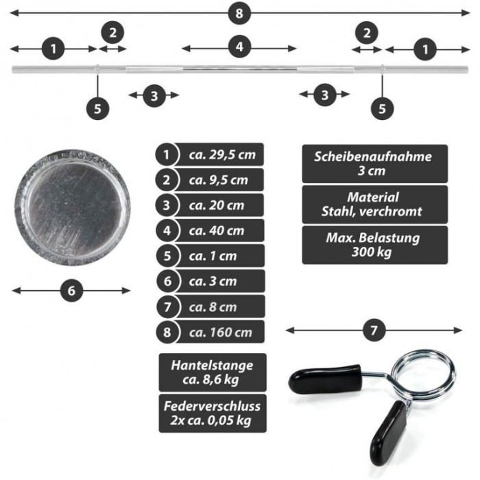 Vhodná pro trénink hrudníku, paží, ramen, krku, posilování, rehabilitační sporty, kulturistiku, bench press, mrtvé tahy, dřepy, výpady, kliky atd. Podpěrná tyč na činky MAXXIVA je vhodná pro všechny komerčně dostupné zátěžové desky s držákem desky o průměru 3 cm - průměr otvoru 30/31 mm. Pultová deska je upevněna pojistným kroužkem, který zabraňuje sklouznutí závaží během pohybu. Rychlovýměnné pružinové zámky bezpečně upevňují závaží k čince a zaručují pohodlnou výměnu závaží. Rukojeti s křížovým závitem na tyči umožňují bezpečné uchopení tyče.