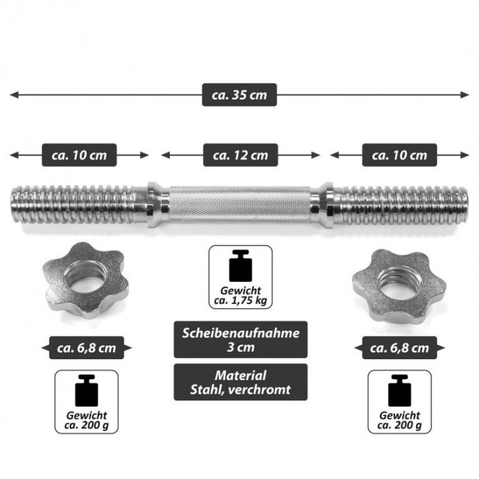 Optimální činková tyč pro použití v posilovně i doma, vhodná pro trénink hrudníku, paže, ramena, krku, posilování, rehabilitační sporty a kulturistiku. Je vhodná pro všechny standardní zátěžové talíře s držákem talíře 10 cm a průměrem otvoru 30/31 mm. Hvězdicové zámky bezpečně fixují závaží na tyči činky, takže výměna závaží je rychlejší a snadnější. Rukojeti jsou křížově vroubkované pro bezpečné uchopení. Každá tyč je také dodávána se dvěma pevnými objímkami, které zabraňují zafixování závaží při zvedání. Závaží nejsou součástí dodávky.