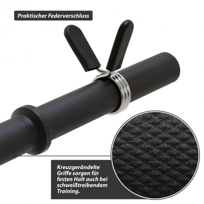 Optimální činka pro použití v posilovně i doma, vhodná pro trénink hrudníku, paží, ramen, krku, posilování, rehabilitační sporty, kulturistiku, bench press, mrtvé tahy, dřepy, výpady, kliky a další. Je vhodná pro dostupné zátěžové desky s 3 cm držákem kotouče a průměrem otvoru 30/31 mm. Protiskluzová deska je upevněna pojistným kroužkem, aby se zabránilo sklouznutí závaží při pohybu. Pružiny, které lze rychle vyměnit, upevňují závaží bezpečně na tyč činky a zaručují snadnou výměnu závaží. Rukojeti jsou křížově vroubkované pro bezpečné uchopení.