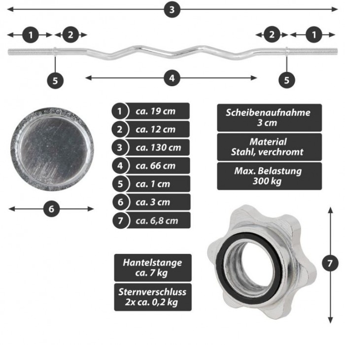 Zakřivený tvar tyče umožňuje různé možnosti úchopu pro procvičení různých částí svalů paží a umožňuje procvičit konkrétní svalové skupiny i komplexní procvičení celého těla. Ideální pro náročný trénink s menším zatížením zápěstí než s činkou. Díky zakřivenému tvaru je činka MAXXIVA vhodná zejména pro efektivní a účinný trénink paží. Kompatibilní se všemi 30mm zátěžovými deskami, včetně 1 páru hvězdicových zámků. Hvězdicové upevňovací prvky lze poměrně rychle uvolnit a opět bezpečně upevnit, takže je zaručena pevná fixace závaží.