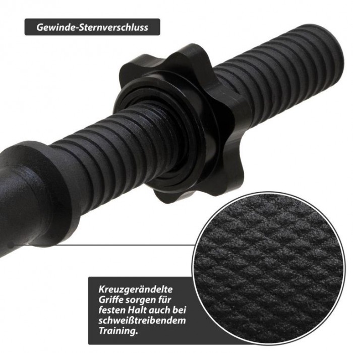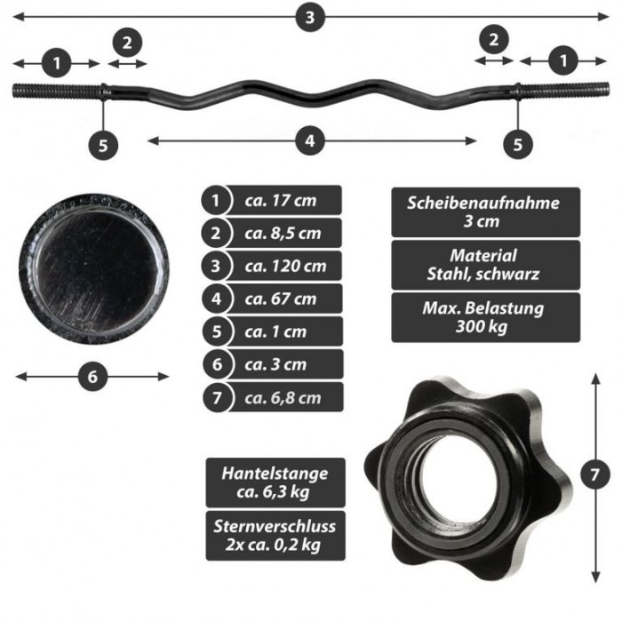 Optimální činka pro použití v posilovně i doma. Zakřivený tvar tyče umožňuje různé možnosti úchopu pro použití různých partií svalů paží a umožňuje cíleně procvičovat konkrétní svalové skupiny i komplexní procvičení celého těla. Ideální pro náročný trénink s menší zátěží zápěstí než s činkou. Díky zakřivenému tvaru je zvláště vhodná pro efektivní a efektivní trénink paží. Je vhodná pro dostupné zátěžové desky s průměrem otvoru 30 mm. Hvězdicové zámky, které lze rychle vyměnit, bezpečně fixují závaží na tyči činky a zaručují snadnou výměnu závaží.