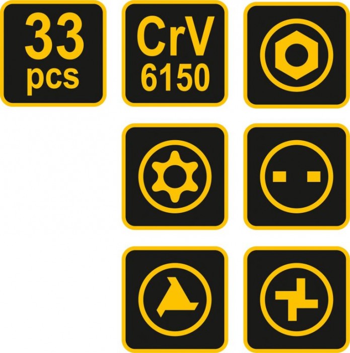 Sada bezpečnostních bitů. Jsou vyrobeny z chrom-vanadiové oceli CrV. Vše je uloženo v praktické, plastikové krabičce, takže vše máte ihned při ruce.