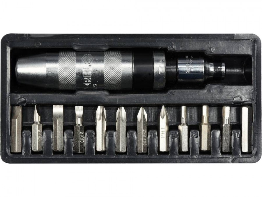 Sada obsahuje rázový šroubovák s přepínatelným pravým / levým chodem. Při úderu kladiva do šroubováku se síla převede vnitřním mechanismem na krouticí moment. Tento šroubovák je vhodný pro bezpečné utažení připevňovacích šroubů a pro uvolnění zadřených šroubů.