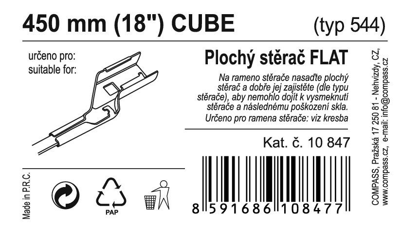 Stěrač je balen pouze v papírovém obalu „papper roll", ze kterého je možné stěrač jednoduše vyndat (prohlédnout si jej, vyzkoušet), a případně jej vrátit zpět do obalu. Každé balení stěrače je opatřeno štítkem s označením (včetně délky, čárového kódu i vyobrazení typu ramínka, na který jej lze použít). Nejdůležitějším faktorem kvality všech plochých stěračů je zpracování kovového pružného členu. Ten pružný člen má zásadní vliv na kvalitu stírání a životnost stěrače. Stěrače Compass jsou vždy osazovány vysoce kvalitním pružným členem.