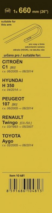 Plochý stěrač Flat (na přední okno) se speciálním uchycením. Vysoce kvalitní pružný člen plochého stěrače zajišťuje stejnoměrný tlak grafitového břitu v celé jeho délce, což zamezuje rozmazávání nečistot a vytváření pruhů. Délka stěrače a systém uchycení na ramínko je přizpůsobena těmto vybraným vozům: Citroën C1 I [B0] 06/05 - 06/14, Hyundai H 350 04/14, Peugeot 107 [B0] 06/05 - 06/14, Renault Twingo I [C0./S0.] 03/93 - 05/07, Toyota Aygo 02/05 - 06/14