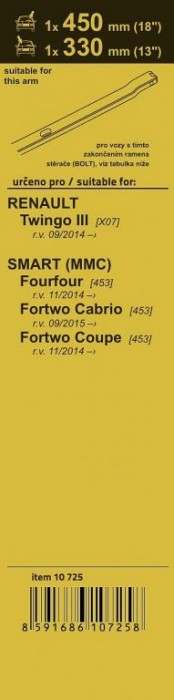 Sada dvou plochých stěračů typu Flat (řidič + spolujezdec) se speciálním uchycením. Dopřejte si zásobu těchto kvalitních stěračů. Délky stěračů a systém uchycení na ramínko jsou přizpůsobeny těmto vybraným vozům - Renault Twingo III [X07] 09/14, Smart (MMC) Forfour [453] 11/14, Smart (MMC) Fortwo Cabrio [453] 09/15, Smart (MMC) Fortwo Coupé [453] 11/14