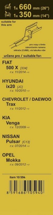 Sada dvou plochých stěračů FLAT (řidič + spolujezdec) se speciálním uchycením. Délky stěračů a systém uchycení na ramínko jsou přizpůsobeny vybraným vozům (viz tabulka použití). Vysoce kvalitní pružný člen plochého stěrače zajišťuje stejnoměrný tlak grafitového břitu v celé jeho délce.