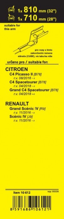 Sada dvou plochých stěračů FLAT (řidič + spolujezdec) se speciálním uchycením. Délky stěračů a systém uchycení na ramínko jsou přizpůsobeny vybraným vozům (viz tabulka použití).