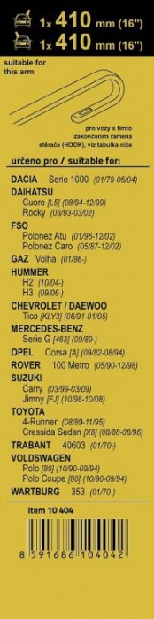 Sada dvou plochých stěračů FLAT (řidič + spolujezdec) se speciálním uchycením. Délky stěračů a systém uchycení na ramínko jsou přizpůsobeny vybraným vozům (viz tabulka použití). Vysoce kvalitní pružný člen plochého stěrače zajišťuje stejnoměrný tlak grafitového břitu v celé jeho délce.